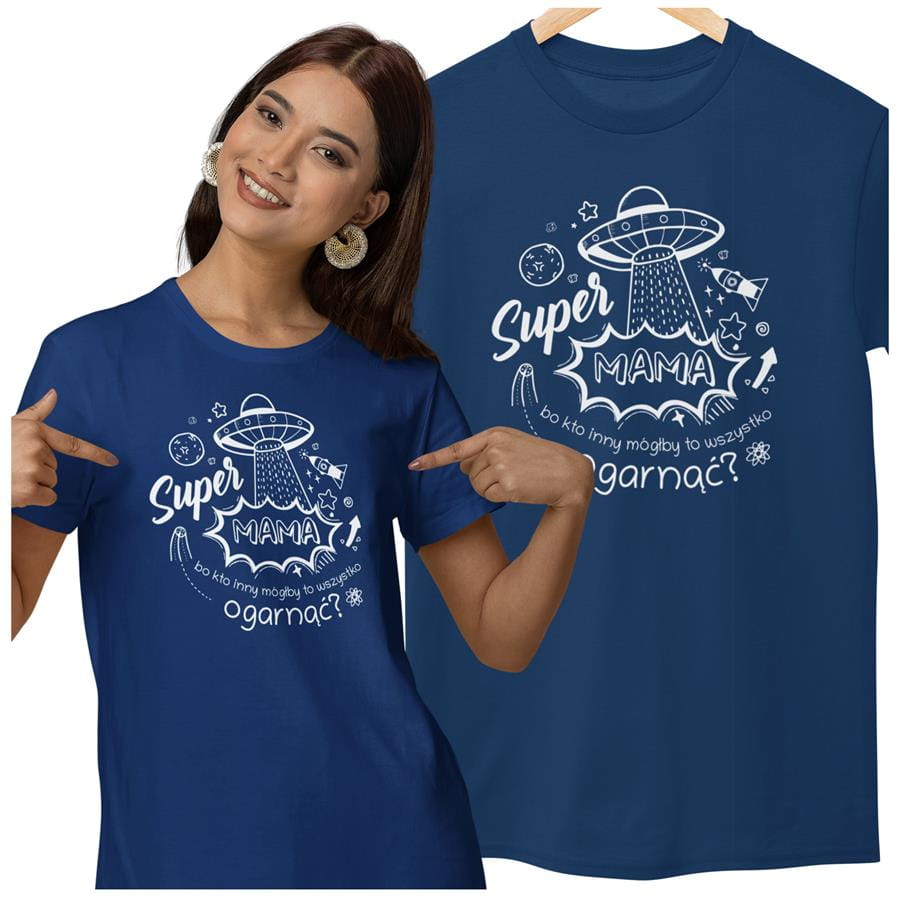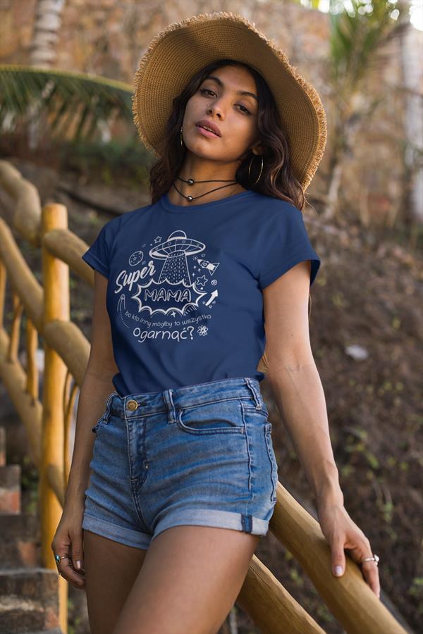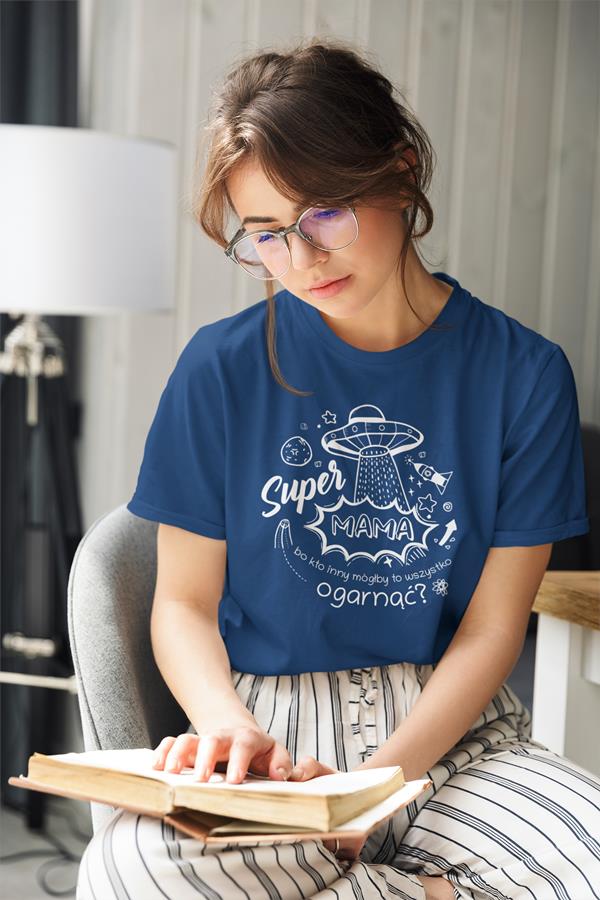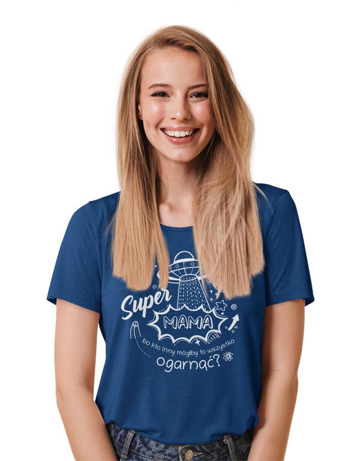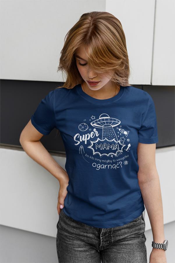 Koszulka dla Mamy na Dzień Mamy prezent z napisem "Super Mama, bo kto inny mógłby to ogarnąć?" kolor granatowy