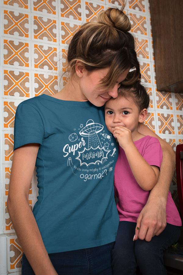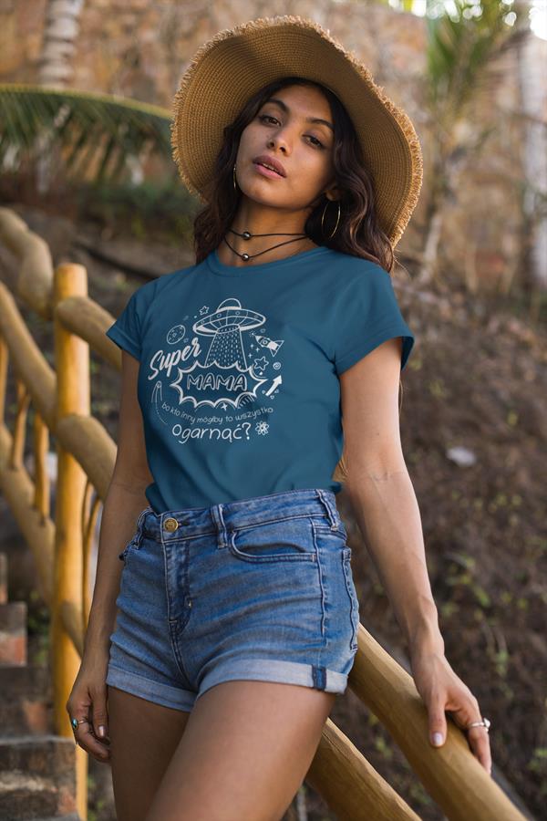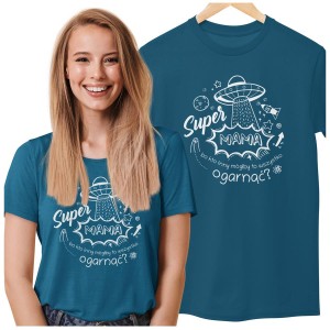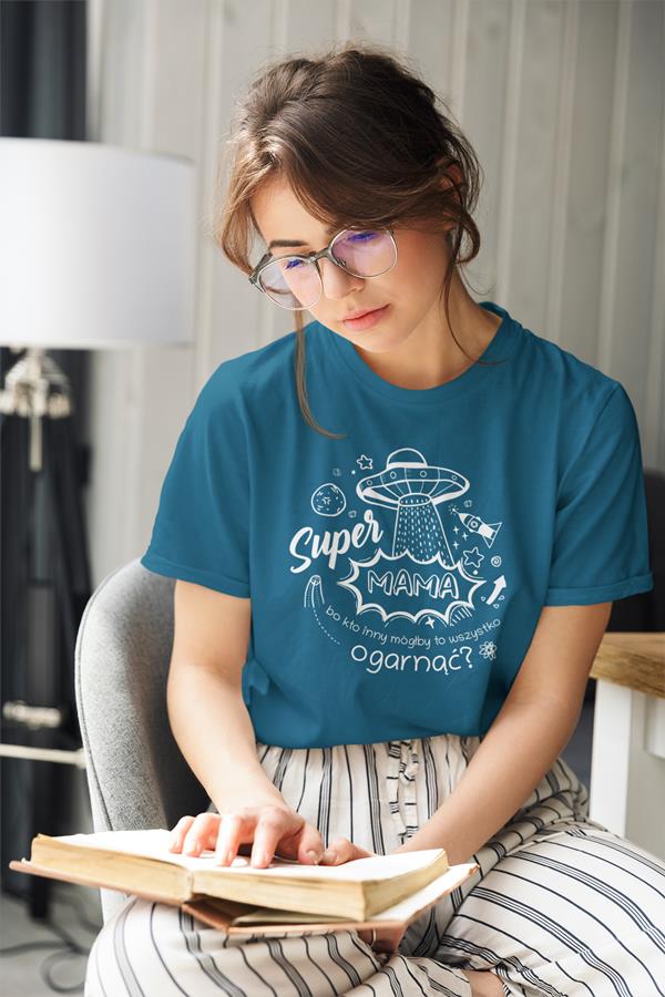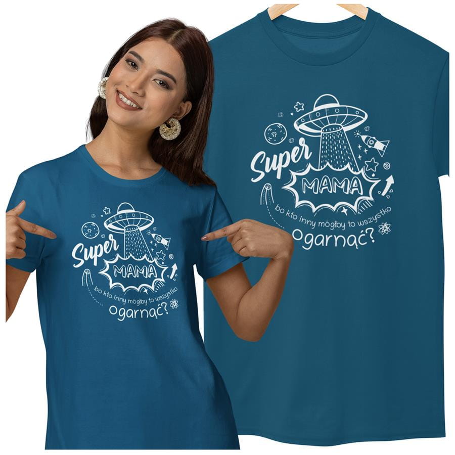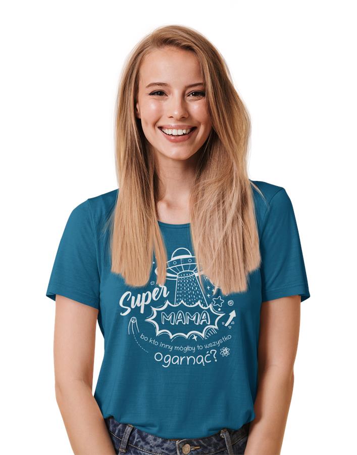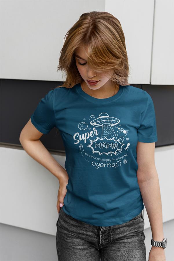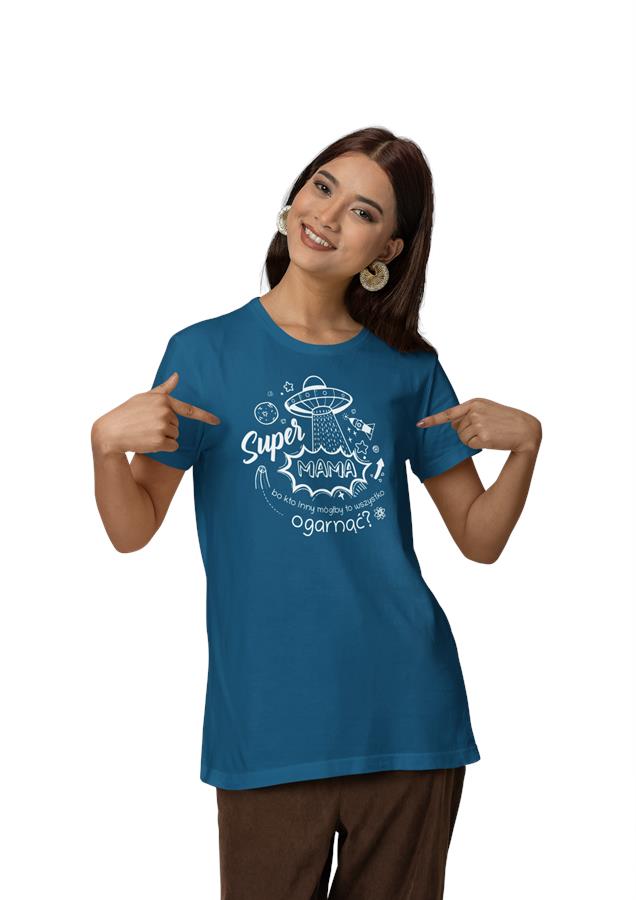 Koszulka dla Mamy na Dzień Mamy prezent z napisem "Super Mama, bo kto inny mógłby to ogarnąć?" kolor petrol blue