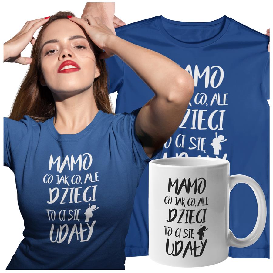 Koszulka dla Mamy na Dzień Mamy z kubkiem prezent z napisem MAMO co jak co, ale dzieci to Ci się udały kolor granatowy