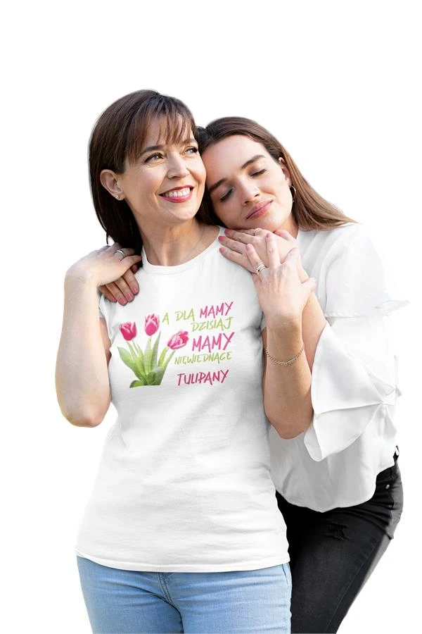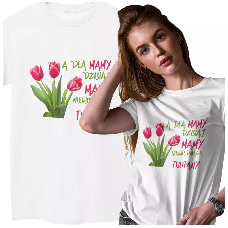 Koszulka dla Mamy na Dzień Mamy z nadrukiem A dla mamy dzisiaj mamy niewiędnące tulipany kolor biały