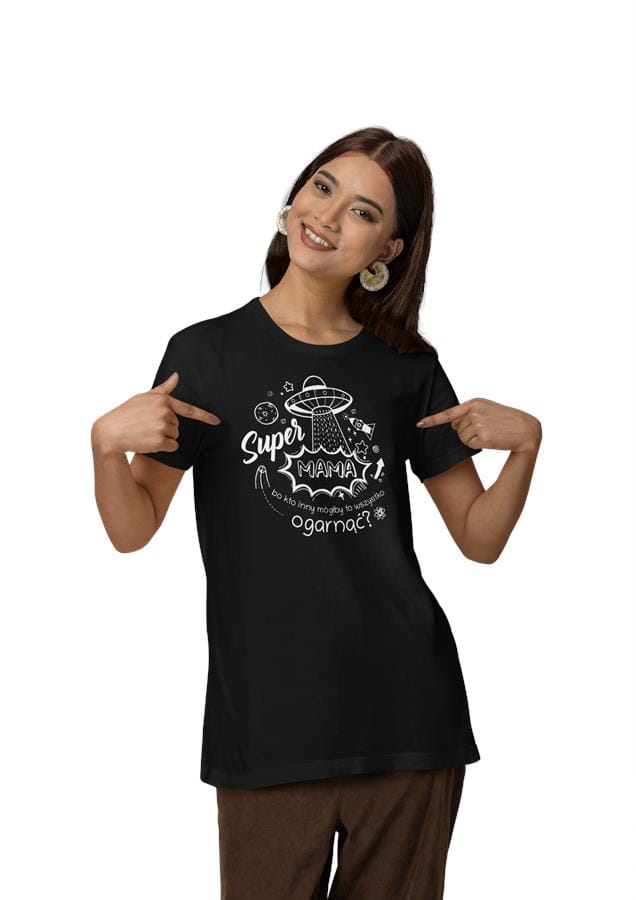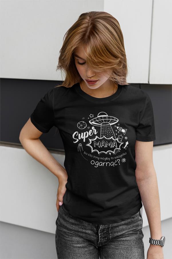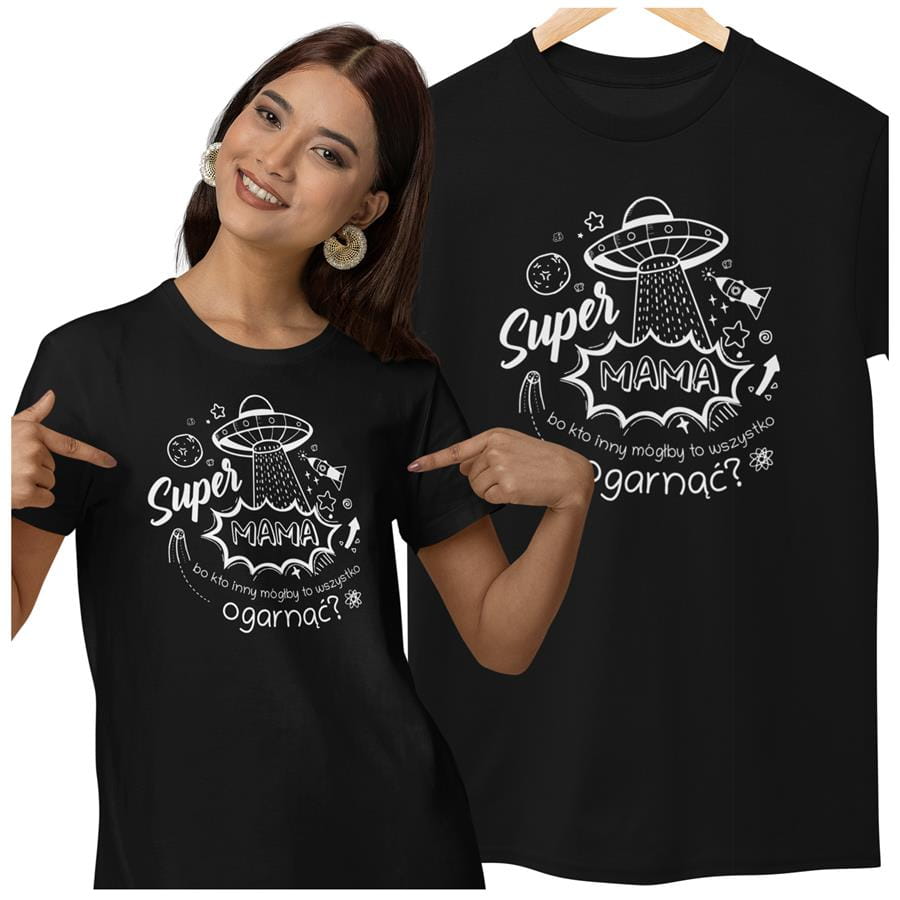 Koszulka z napisem "Super Mama, bo kto inny mógłby to ogarnąć?"