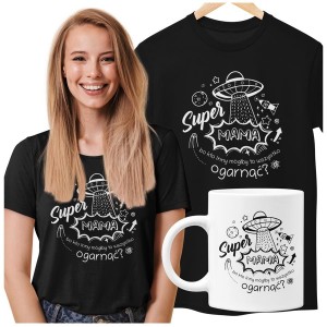 Koszulka dla Mamy na Dzień Mamy zestaw z kubkiem i nadrukiem "Super Mama, bo kto inny mógłby to ogarnąć?" kolor czarny