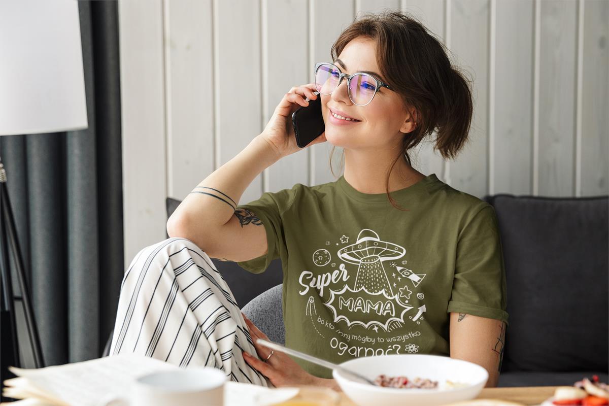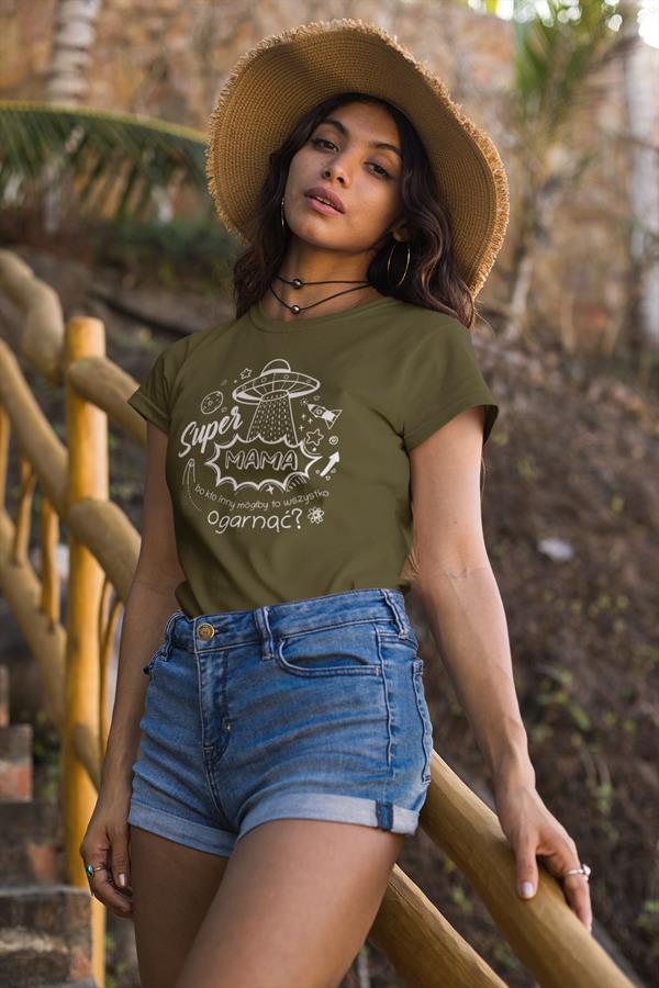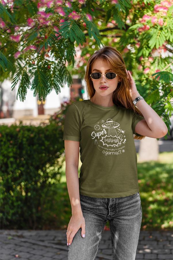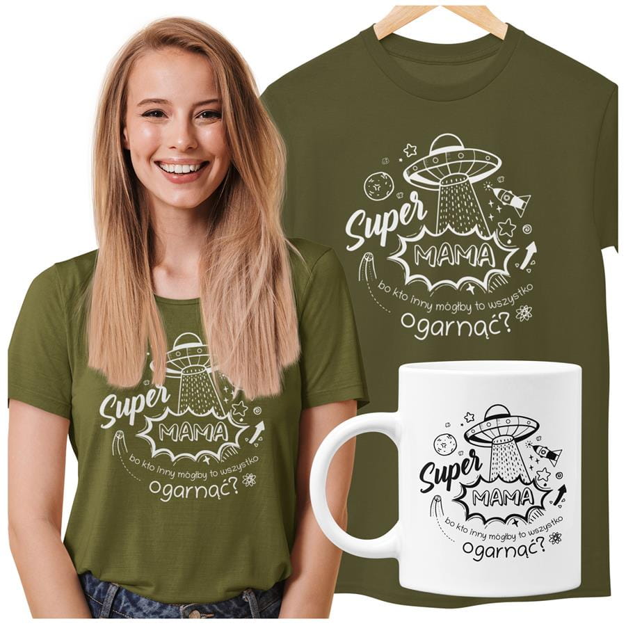 Koszulka dla Mamy na Dzień Mamy zestaw z kubkiem i nadrukiem "Super Mama, bo kto inny mógłby to ogarnąć?" kolor khaki