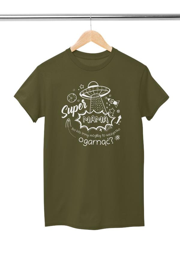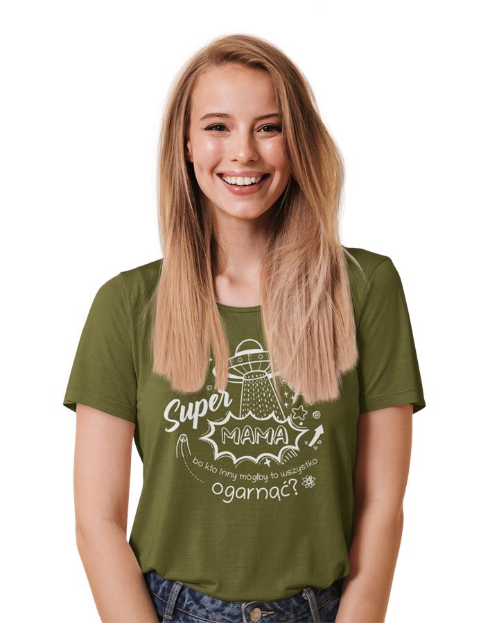 Koszulka z napisem "Super Mama, bo kto inny mógłby to ogarnąć?"