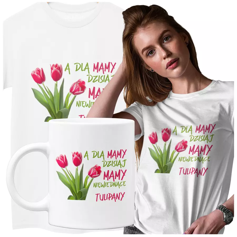 Koszulka dla Mamy na Dzień Mamy zestaw z kubkiem z nadrukiem A dla mamy dzisiaj mamy niewiędnące tulipany kolor biały