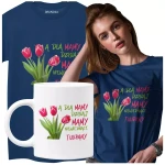 Koszulka dla Mamy na Dzień Mamy zestaw z kubkiem z nadrukiem A dla mamy dzisiaj mamy niewiędnące tulipany kolor granatowy