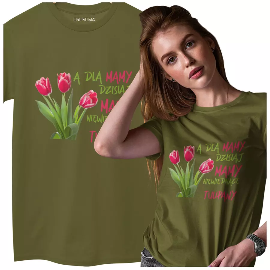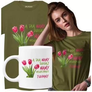 Koszulka dla Mamy na Dzień Mamy zestaw z kubkiem z nadrukiem A dla mamy dzisiaj mamy niewiędnące tulipany kolor khaki