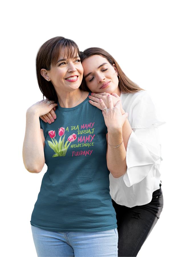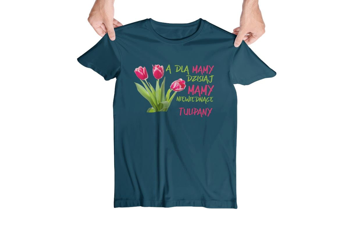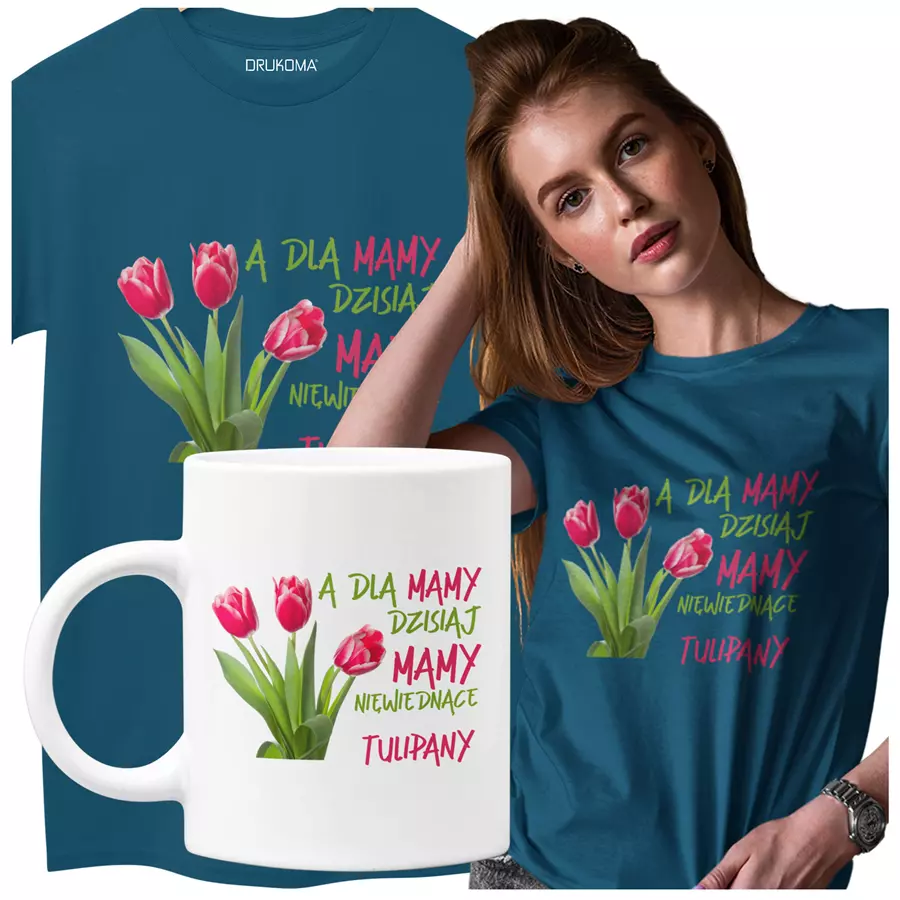 Koszulka dla Mamy na Dzień Mamy zestaw z kubkiem z nadrukiem A dla mamy dzisiaj mamy niewiędnące tulipany kolor petrol blue