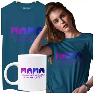 Koszulka dla Mamy na Dzień Mamy zestaw z kubkiem z nadrukiem MAMA najlepsza w całej galaktyce kolor petrol blue