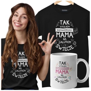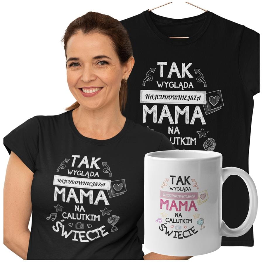 Koszulka dla Mamy na Dzień Mamy zestaw z kubkiem z nadrukiem Tak wygląda najcudowniejsza mama na calutkim świecie kolor czarny