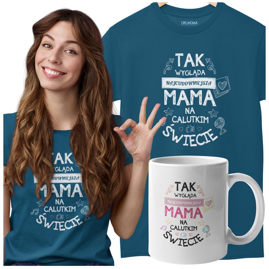 Koszulka dla Mamy na Dzień Mamy zestaw z kubkiem z nadrukiem Tak wygląda najcudowniejsza mama na calutkim świecie kolor petrol blue