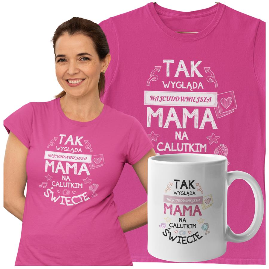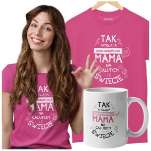 Koszulka dla Mamy na Dzień Mamy zestaw z kubkiem z nadrukiem Tak wygląda najcudowniejsza mama na calutkim świecie kolor różowy