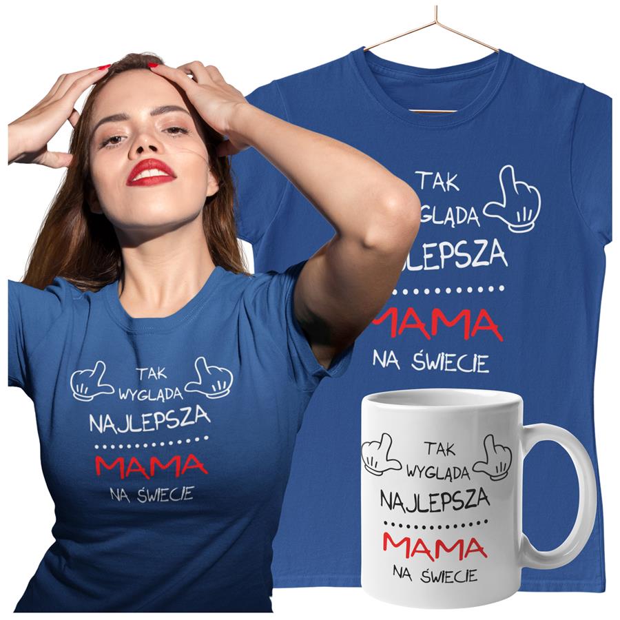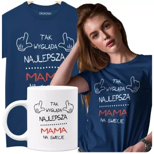 Koszulka dla Mamy na Dzień Mamy zestaw z kubkiem z nadrukiem Tak wygląda najlepsza mama na świecie kolor granatowy