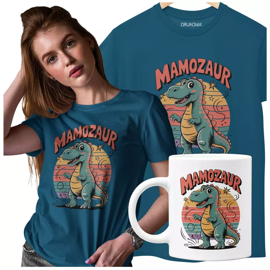 Koszulka dla Mamy na Dzień Mamy zestaw z kubkiem z napisem "MAMOZAUR" kolor petrol