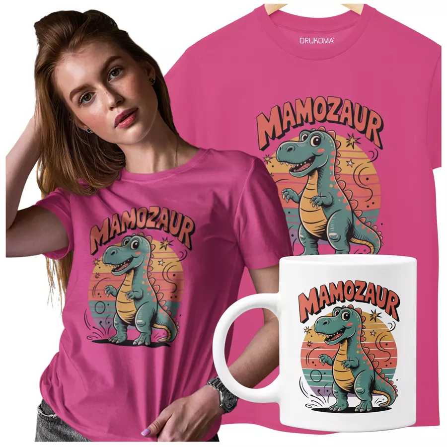 Koszulka dla Mamy na Dzień Mamy zestaw z kubkiem z napisem "MAMOZAUR" kolor różowy