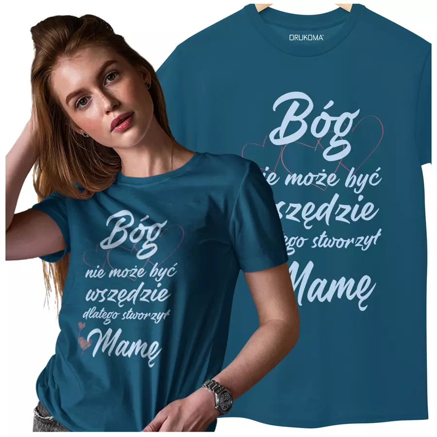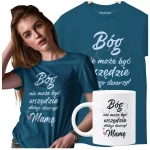 Koszulka dla Mamy z kubkiem na Dzień Mamy prezent koszulka z kolorowym nadrukiem Bóg nie może być wszędzie, dlatego stworzył MAMĘ kolor petrol blue