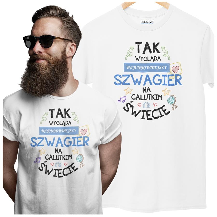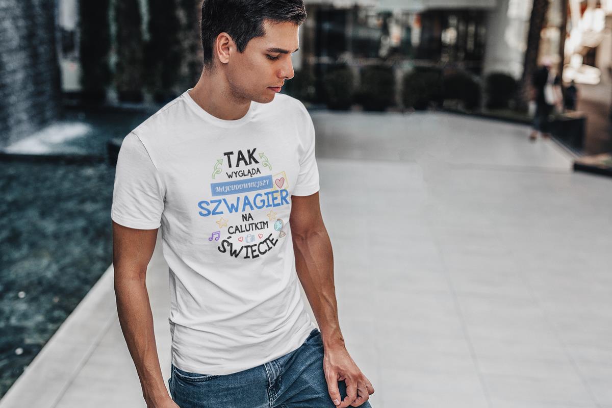 Koszulka dla Szwagra modny prezent na Urodziny stylowa koszulka z napisem "Tak wygląda najcudowniejszy Szwagier na calutkim świecie" w kolorze białym
