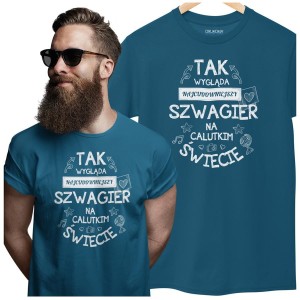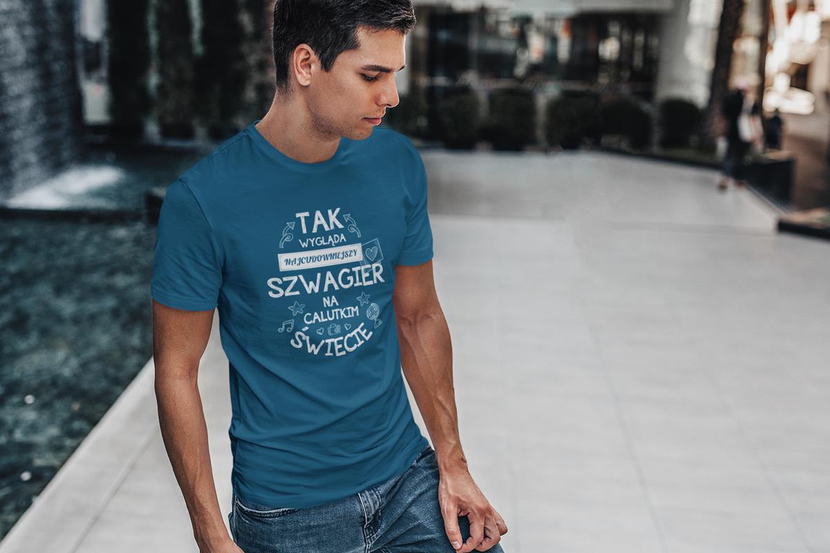 Koszulka dla Szwagra modny prezent na Urodziny stylowa koszulka z napisem "Tak wygląda najcudowniejszy Szwagier na calutkim świecie" w kolorze petrol blue
