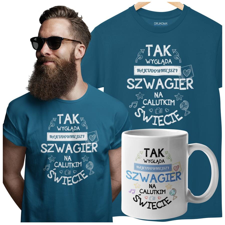 Koszulka dla Szwagra w zestawie z kubkiem z nadrukiem "Tak wygląda najcudowniejszy Szwagier na calutkim świecie" w kolorze petrol blue