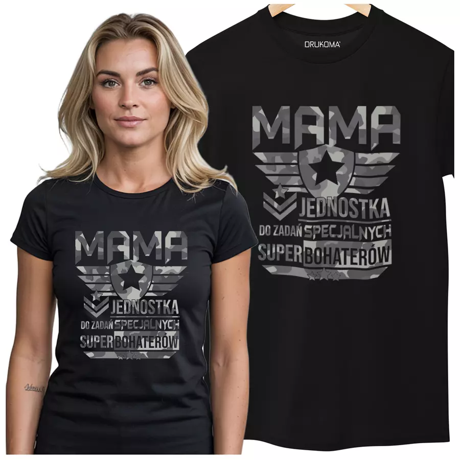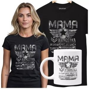 Koszulka dla mamy wraz z kubkiem Z KOLOROWYM NADRUKIEM Mama jednostka do zadań specjalnych super bohaterów KOLOR CZARNY