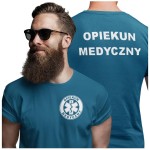 Koszulka męska medyczna dla OPIEKUN MEDYCZNY z logo i napisem OPIEKUN MEDYCZNY na plecach kolor PETROL BLUE