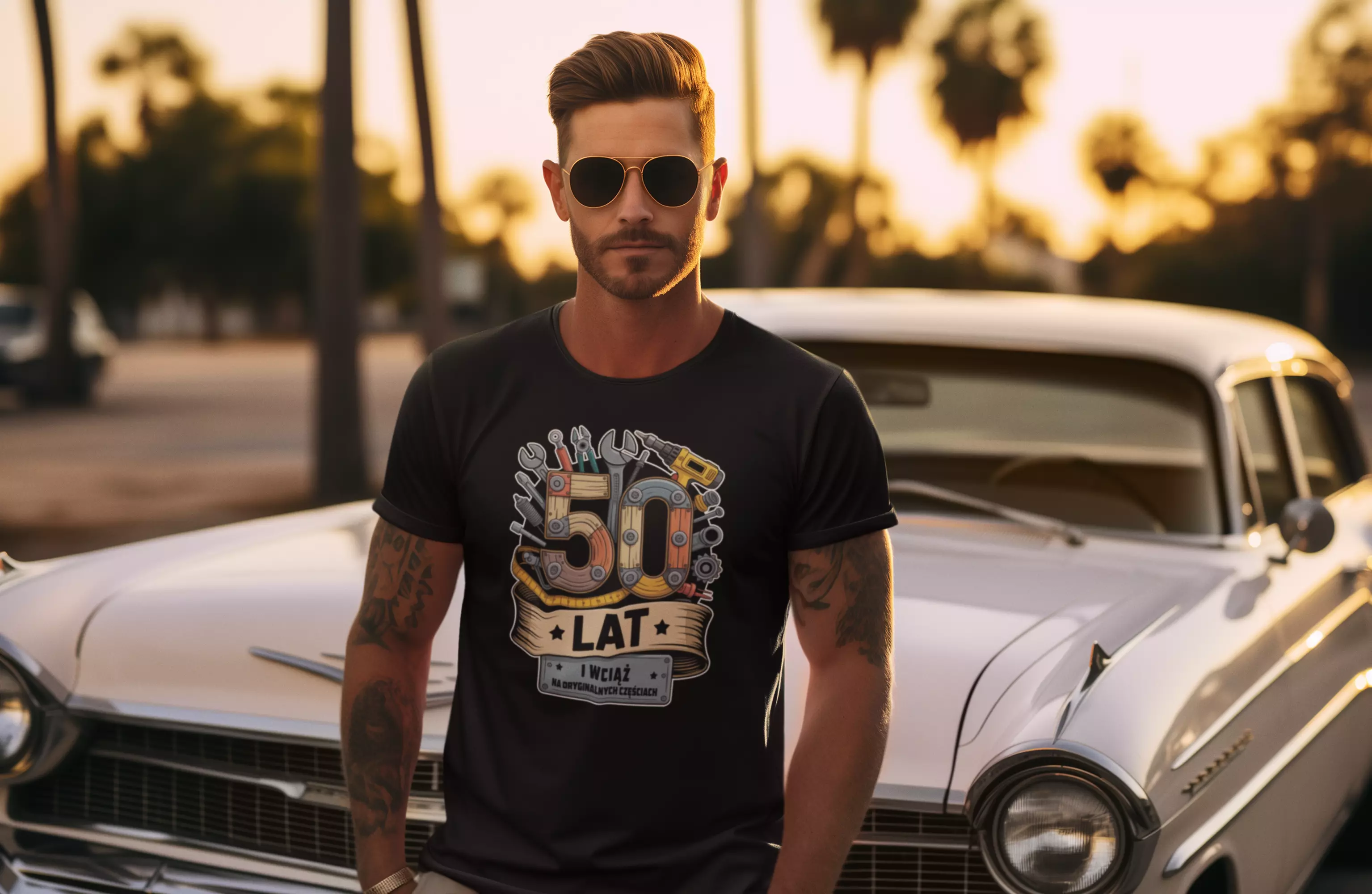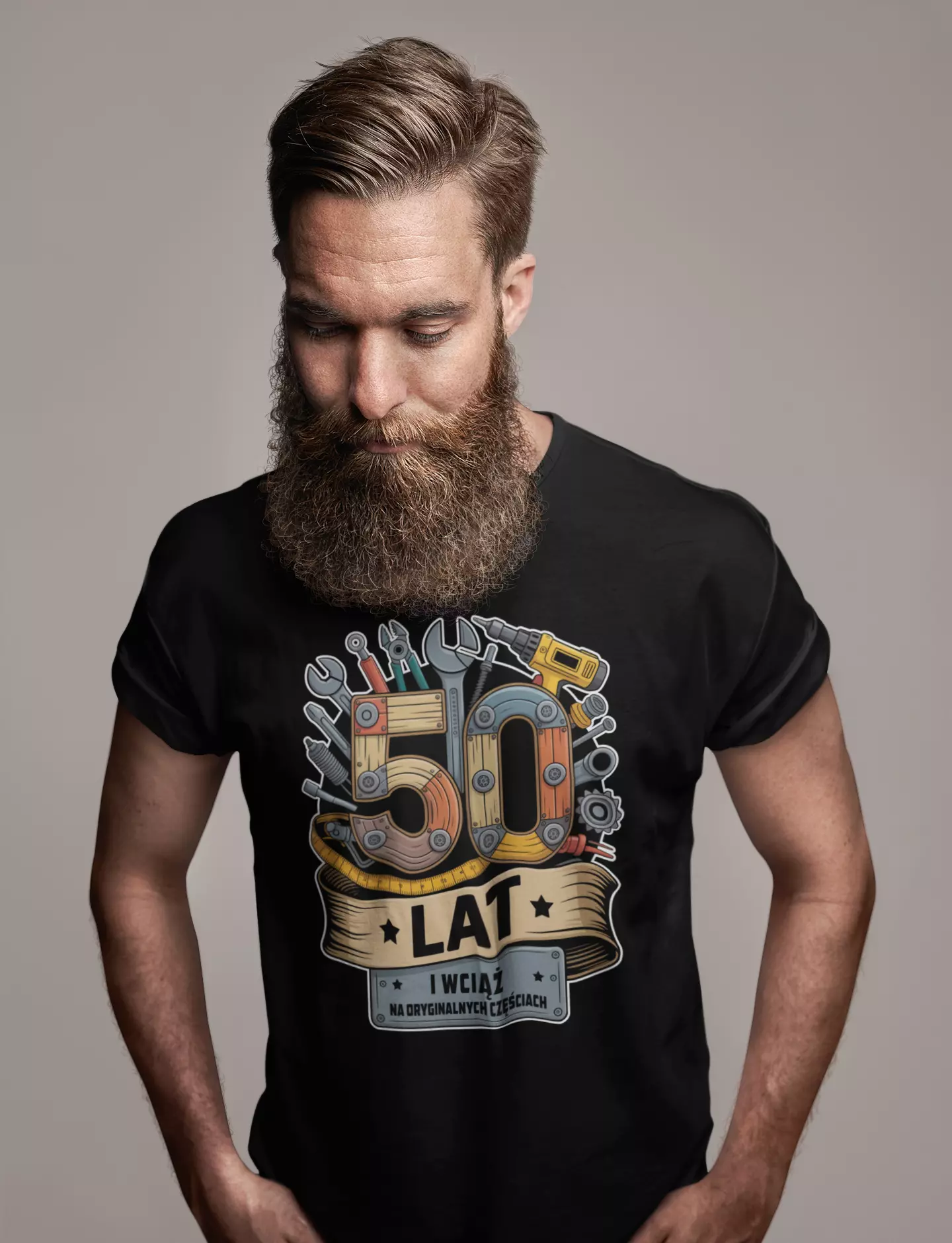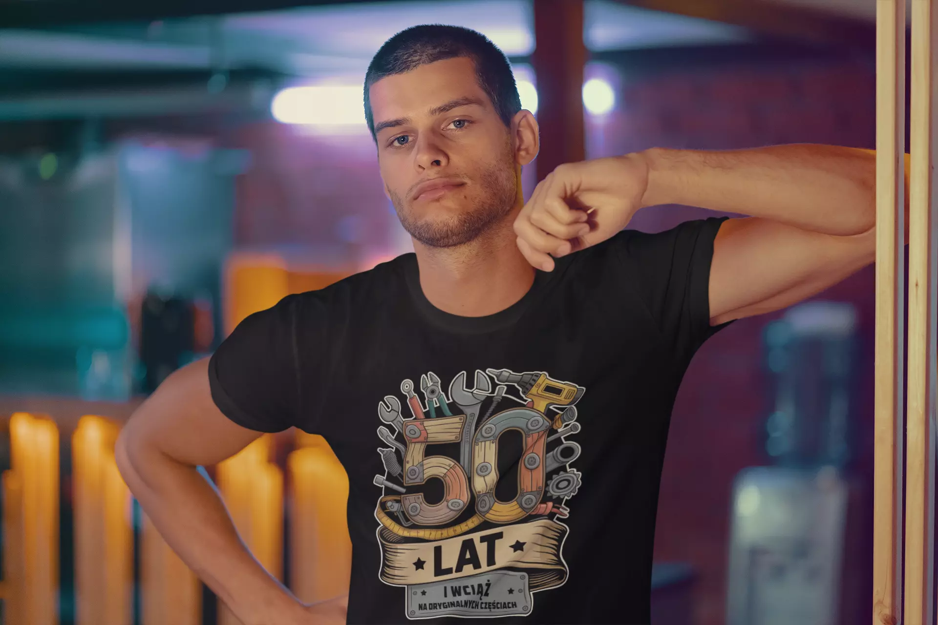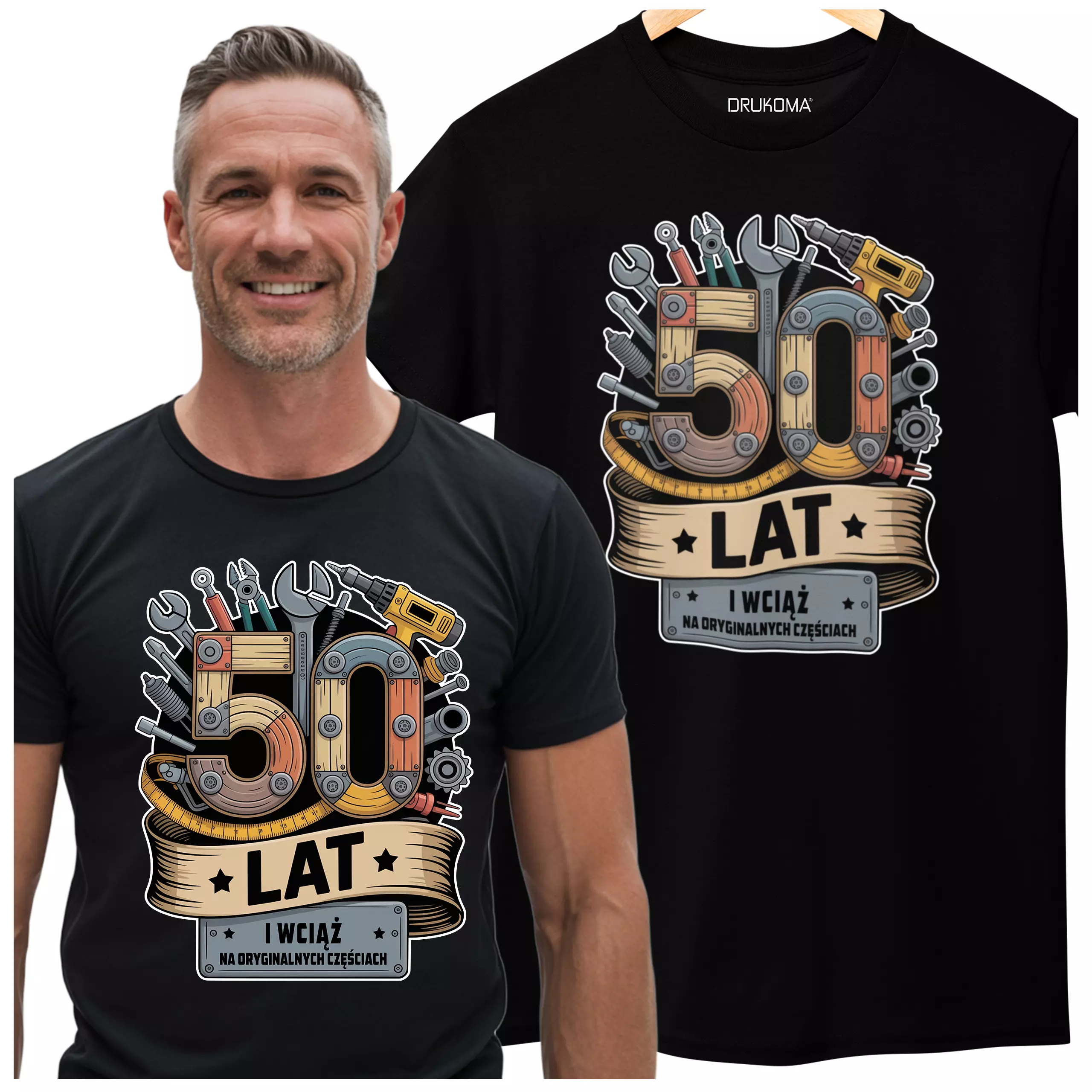 Koszulka na 50 LAT pięćdziesiątkę, urodziny z napisem: "50 LAT i wciąż na oryginalnych częściach" kolor czarny