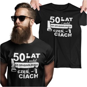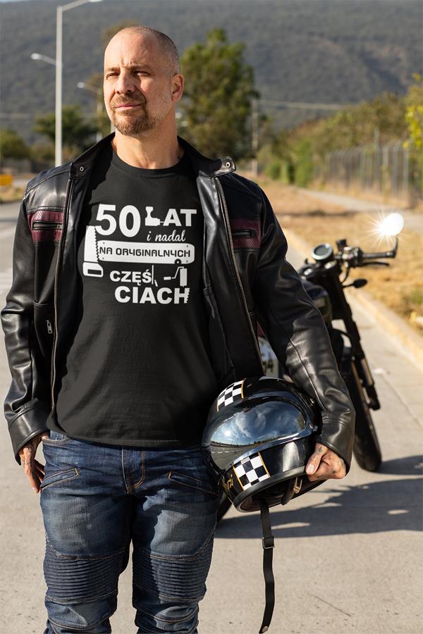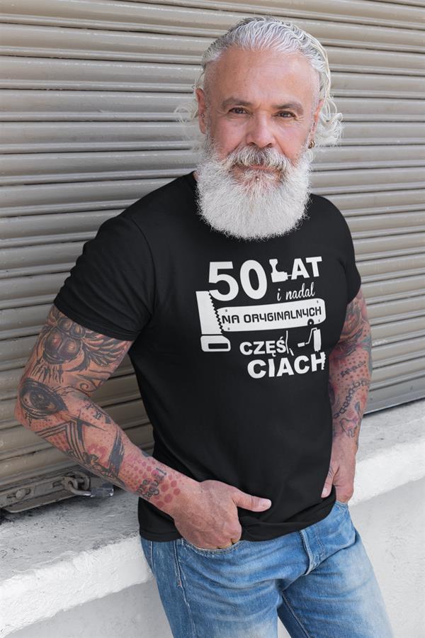 Koszulka na urodziny na 50 pięćdziesiątkę z nadrukiem 50 lat i nadal na oryginalnych częściach