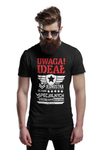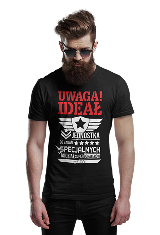 "Uwaga! Ideał, jednostka do zadań specjalnych, oddział superbohaterów" – ta koszulka to nie tylko styl, ale i humor, który podkreśli wyjątkowość obdarowywanej osoby.