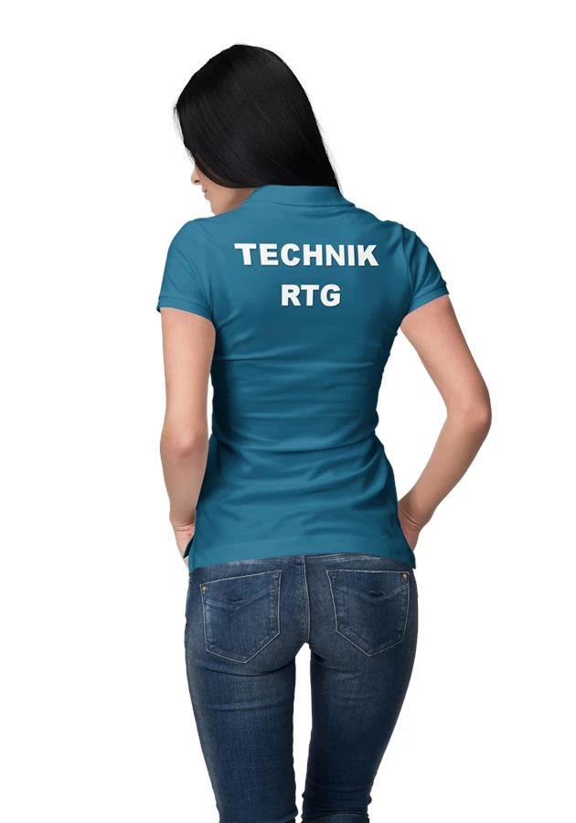 Koszulka polo damska medyczna dla Technika RTG z logo i napisem TECHNIK RTG na plecach kolor ciemny turkus