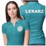 Koszulka polo damska medyczna dla lekarza z logo i napisem lekarz na plecach kolor turkus