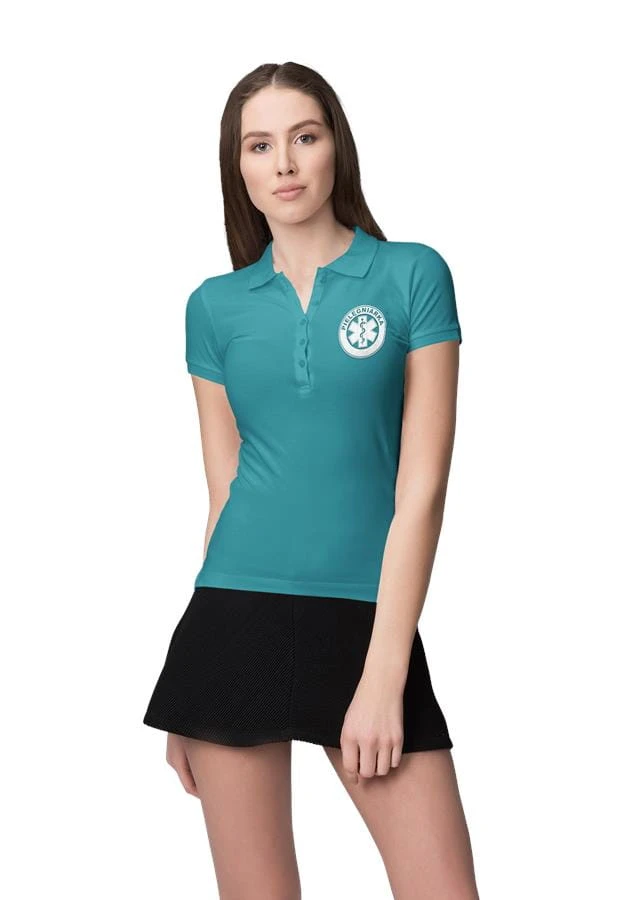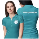 Koszulka polo damska medyczna dla pielęgniarki z logo i napisem pielęgniarka na plecach kolor turkus