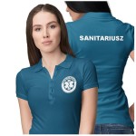 Koszulka polo damska medyczna dla sanitariusza z logo i napisem SANITARIUSZ na plecach kolor ciemny turkus
