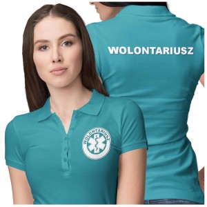 Koszulka polo damska medyczna dla wolontariusza z logo i napisem wolontariusz na plecach kolor turkus