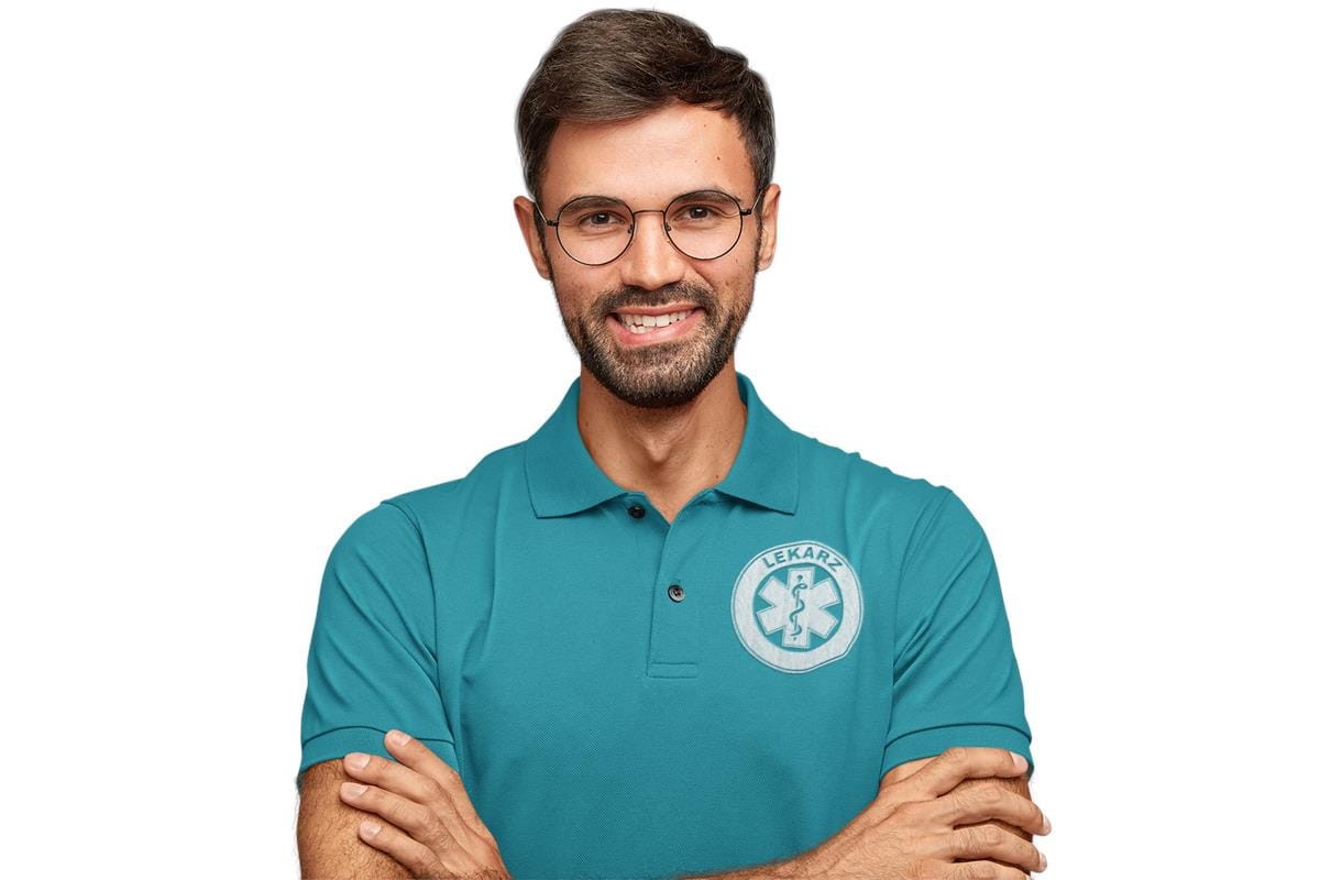 Koszulka polo męska medyczna dla lekarza z logo i napisem lekarz na plecach kolor turkus