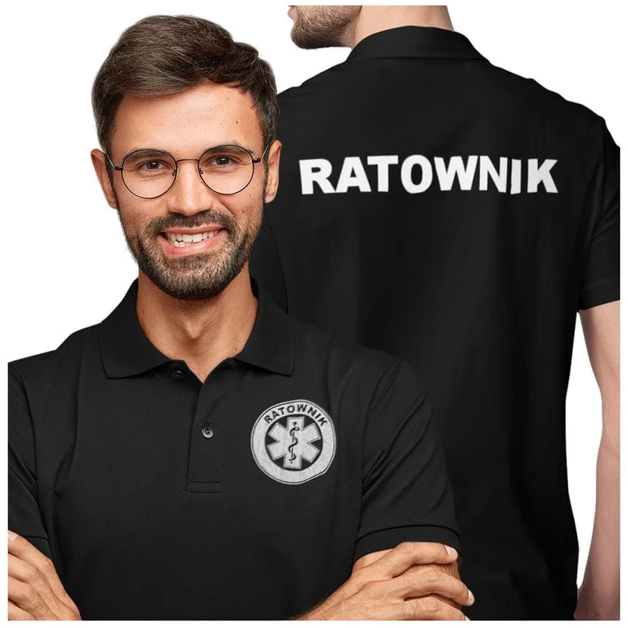 Koszulka polo męska medyczna dla ratownika z logo i napisem ratownik na plecach kolor czarny