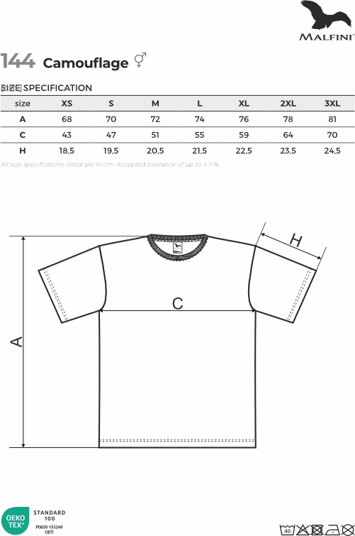 Koszulka unisex Camouflage 144 to stylowy T-shirt o gramaturze 160 g/m², wykonany w 100% z bawełny (Single Jersey), charakteryzujący się modnym wzorem moro. Model posiada krój ze szwami bocznymi, wąską lamówkę przy dekolcie z dodatkiem 5% elastanu oraz taśmę wzmacniającą na ramionach w kolorze camouflage, co gwarantuje trwałość i unikalny wygląd. Wyposażona w satynową metkę, koszulka idealnie nadaje się pod profesjonalne znakowanie: druk cyfrowy, haft, sitodruk, transfer oraz lithotransfer.