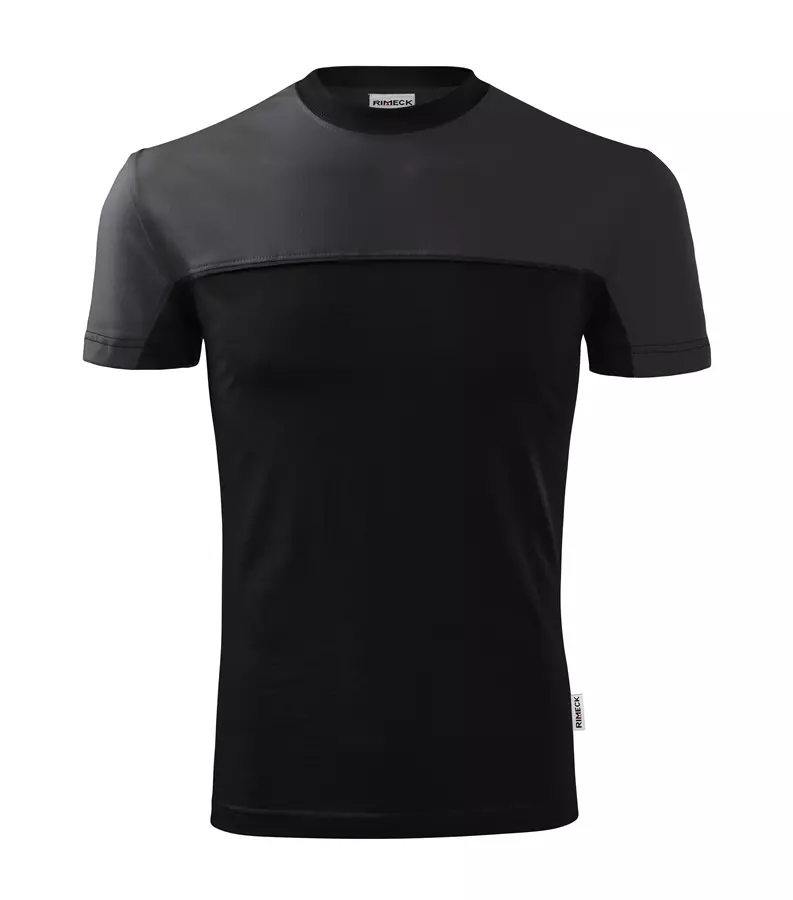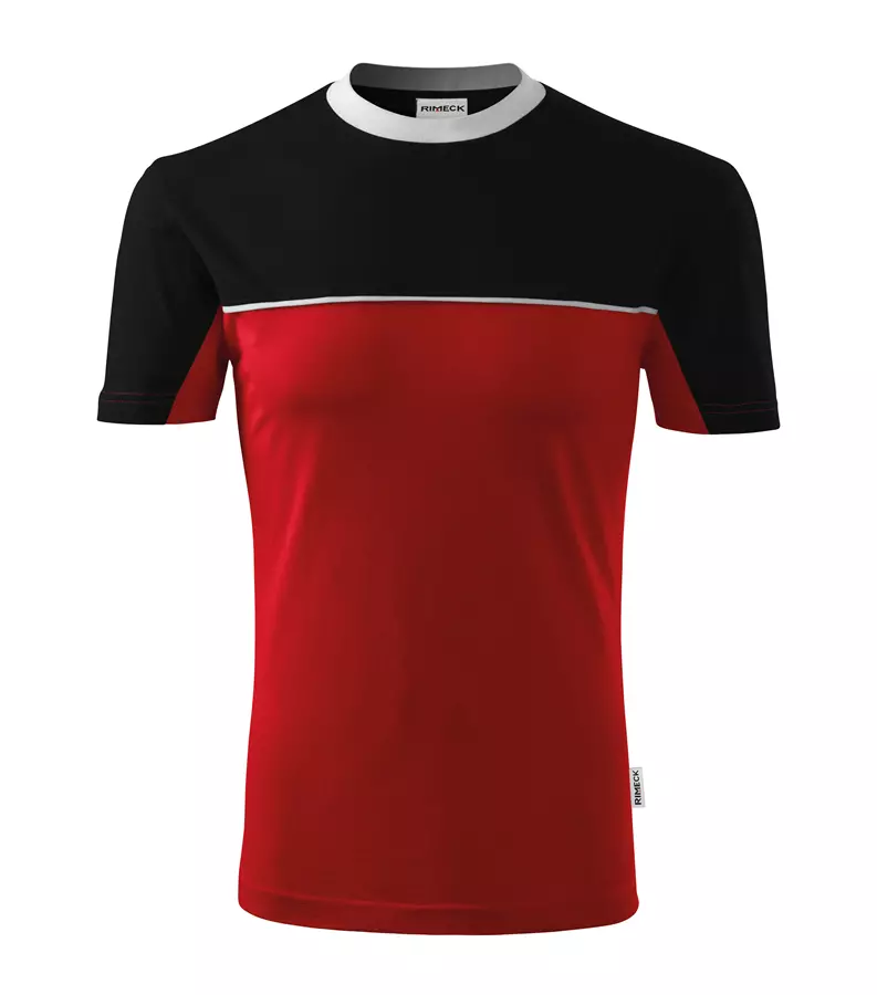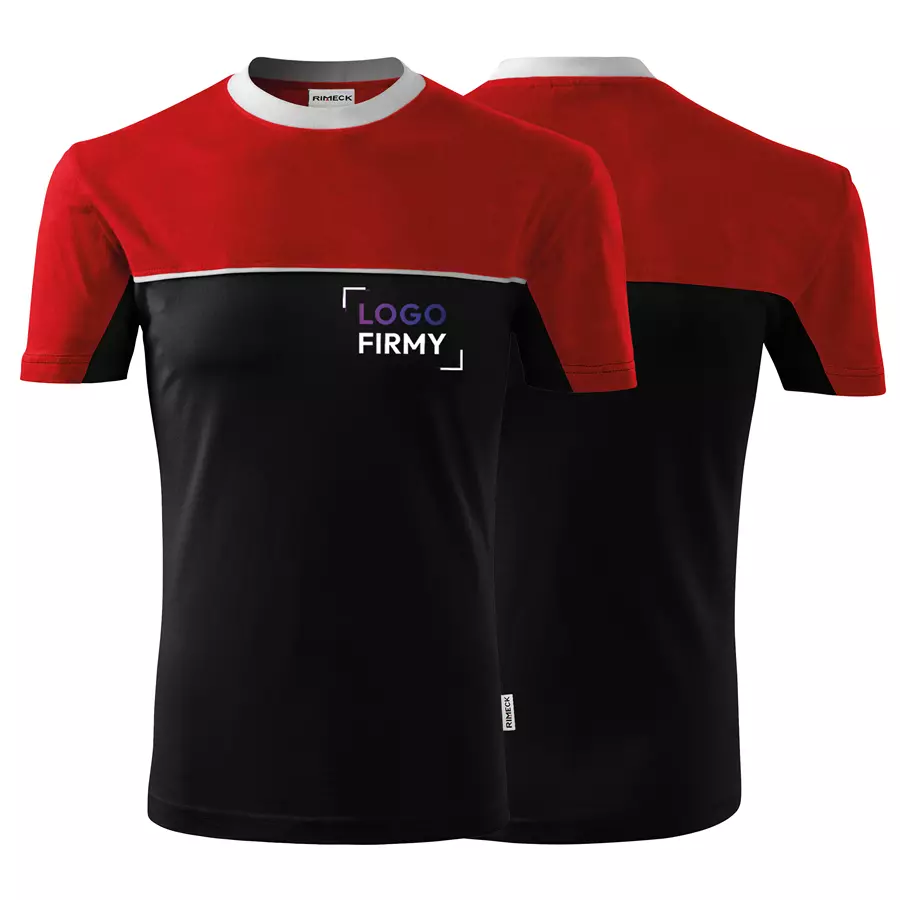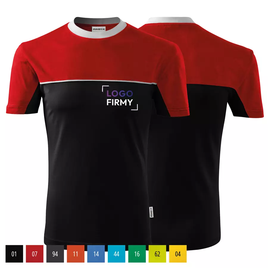 Koszulka unisex Colormix 109 200g marki RIMECK to dwukolorowy T-shirt wykonany w 100% z bawełny (Single Jersey), charakteryzujący się poziomym szwem dzielącym z wszytym paskiem oraz trwałym krojem ze szwami bocznymi. Model posiada dekolt wykończony dzianiną ściągaczową 1:1 z dodatkiem 5% elastanu, wzmacniającą taśmę na ramionach oraz satynową metkę, co gwarantuje komfort i wytrzymałość. Idealna pod znakowanie: haft, sitodruk, transfer cyfrowy, lithotransfer oraz sitodruk transferowy.