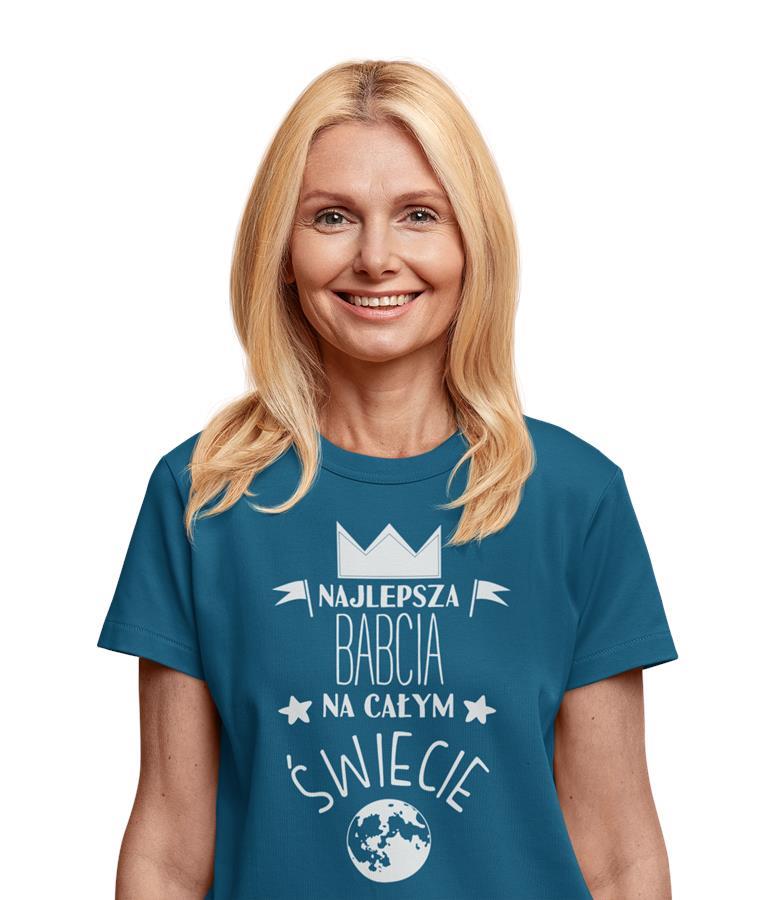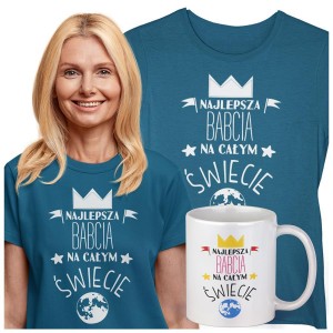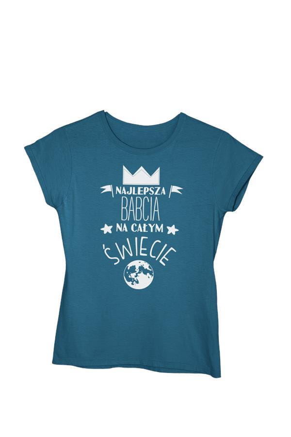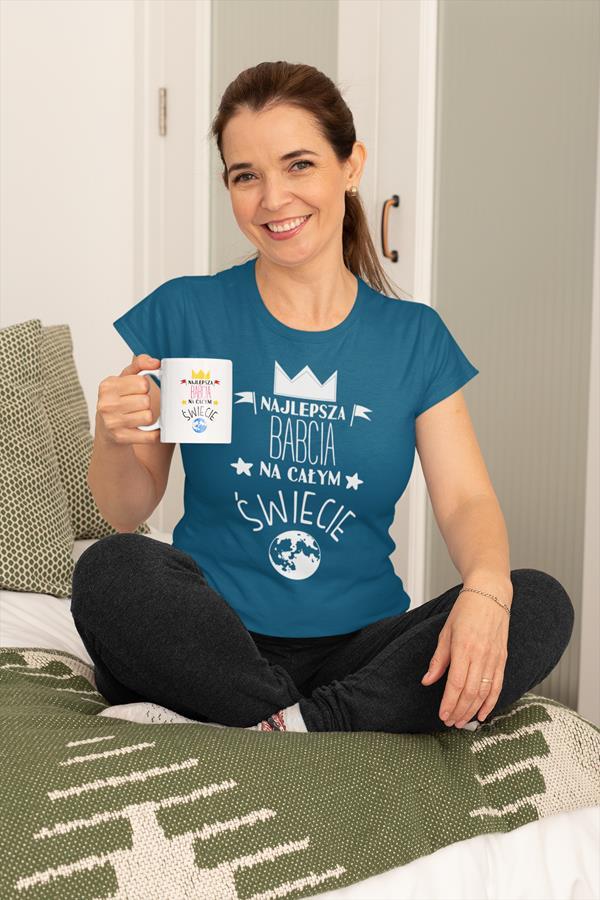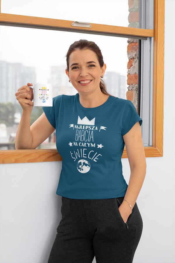 Koszulka z kubkiem dla Babci na Dzień Babci z napisem: "NAJLEPSZA BABCIA NA ŚWIECIE" kolor petrol blue