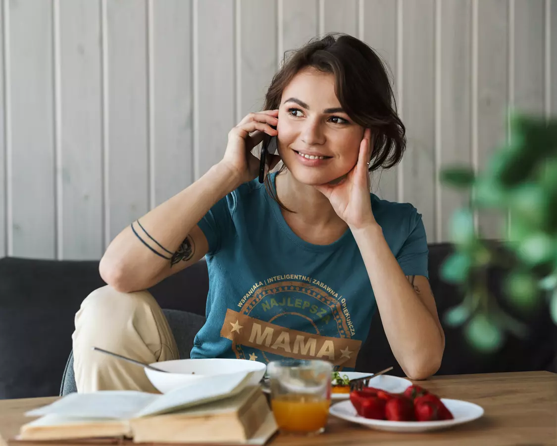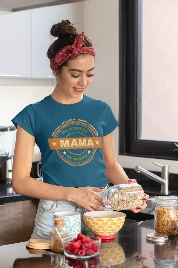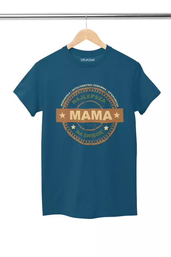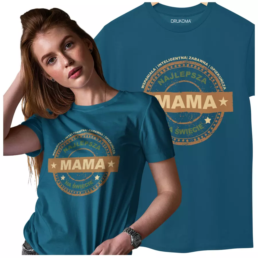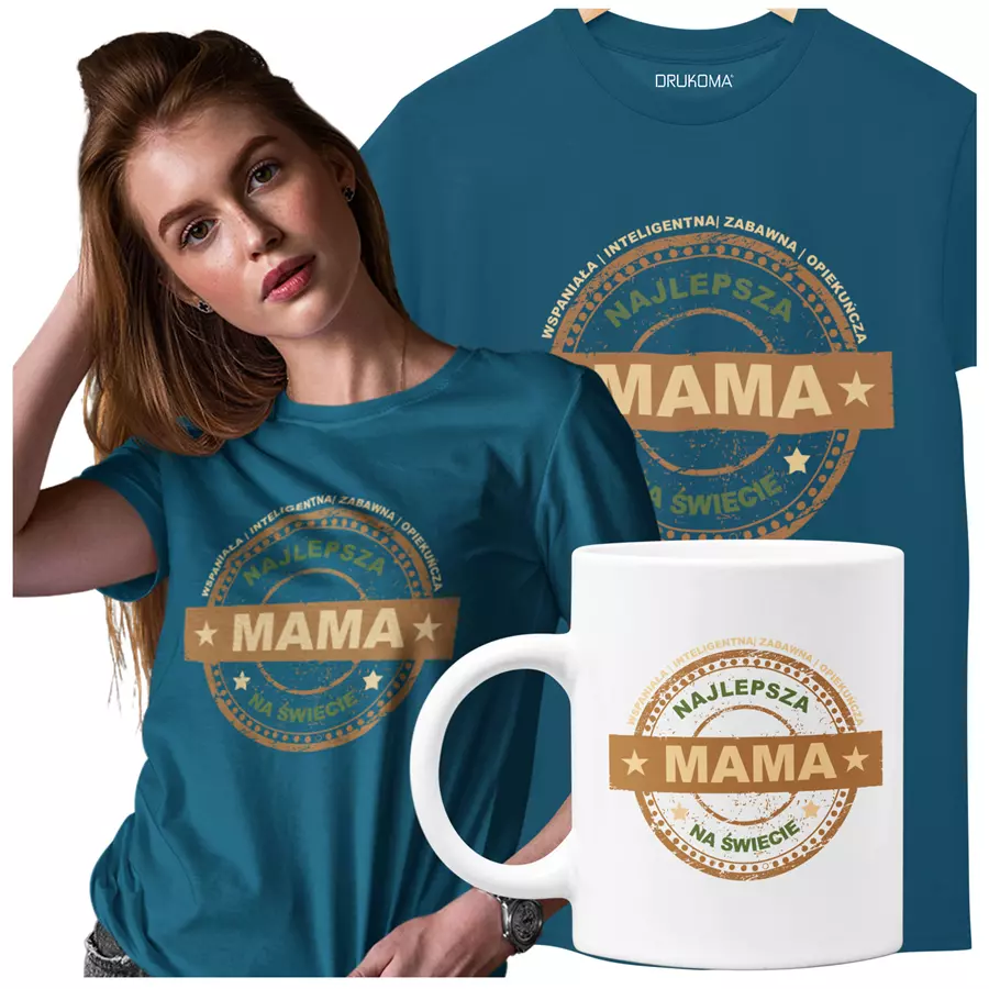 Koszulka z kubkiem dla Mamy na Dzień Mamy prezent z kolorowym napisem: "Najlepsza mama na świecie, wspaniała, inteligentna, zabawna, opiekuńcza" kolor petrol