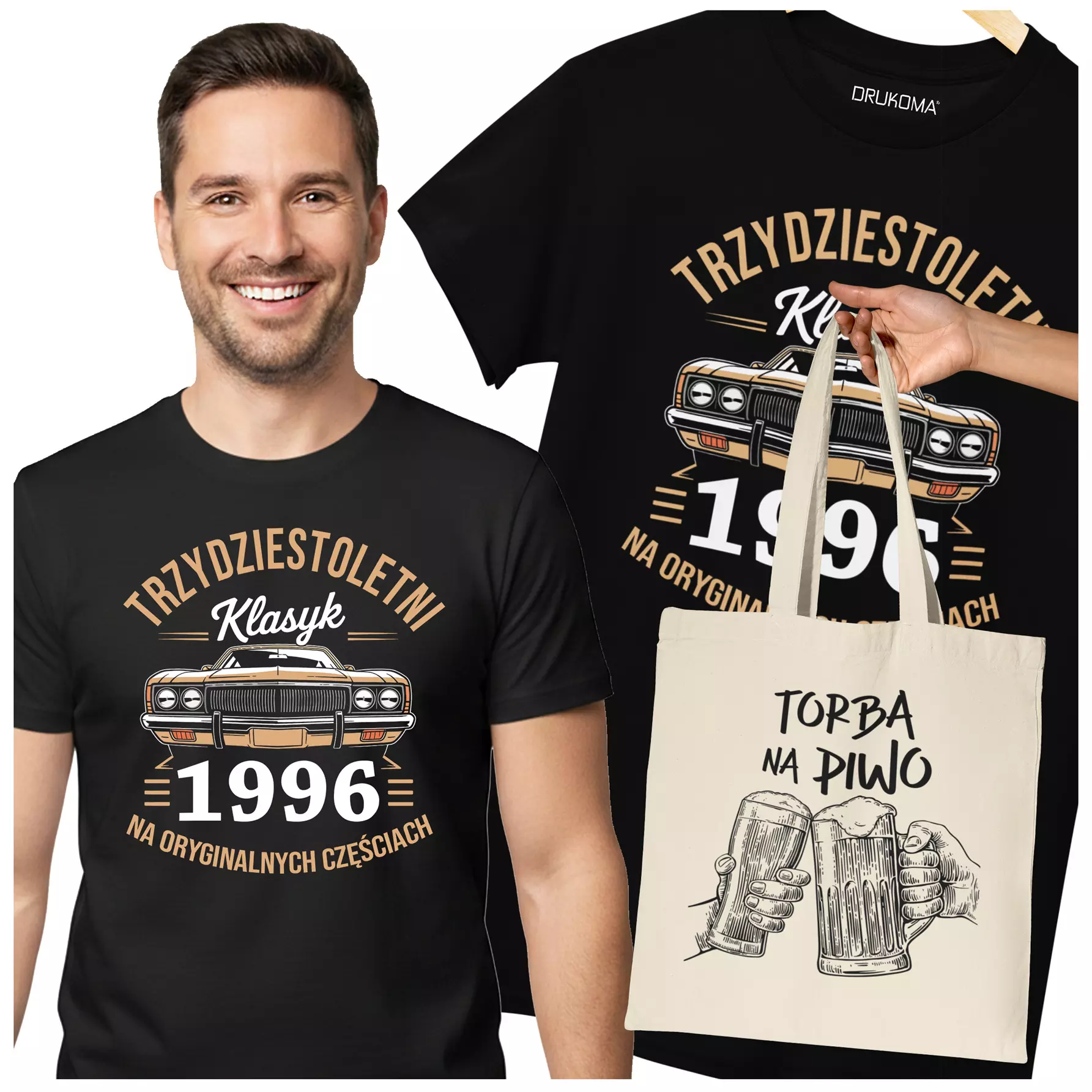 Koszulka z torbą na urodziny na 30 TRZYDZIESTKĘ z napisem: "TRZYDZIESTOLETNI KLASYK 1996 NA ORYGINALNYCH CZĘŚCIACH"