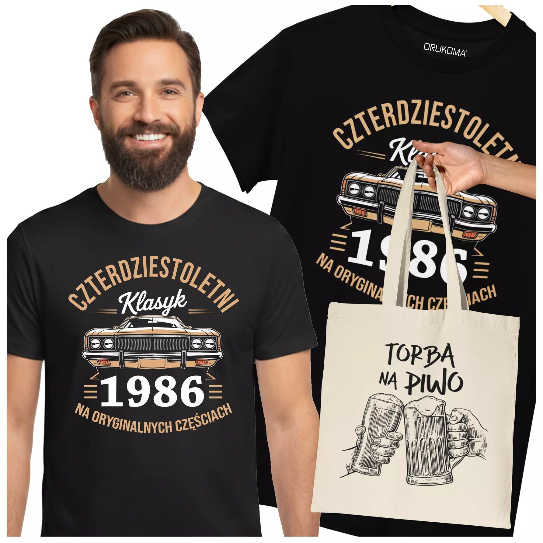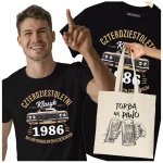 Koszulka z torbą na urodziny na 40 CZERDZISTKĘ z napisem: "CZTERDZIESTOLETNI KLASYK 1986 NA ORYGINALNYCH CZĘŚCIACH"