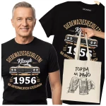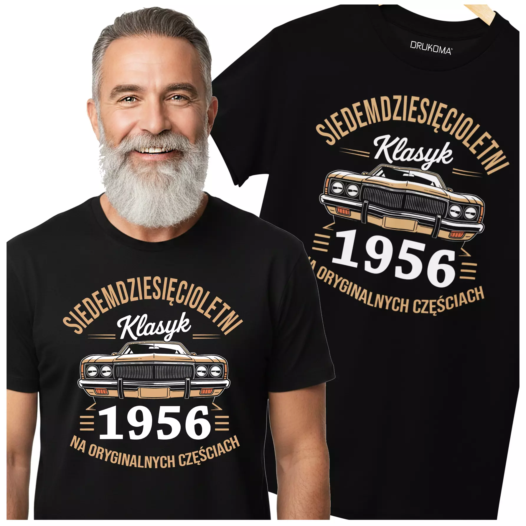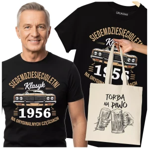 Koszulka z torbą na urodziny na 70 SIEDEMDZIESIĄTKĘ Z NADRUKIEM: "SIEDEMDZIESIĘCIOLETNI KLASYK 1956 NA ORYGINALNYCH CZĘŚCIACH".