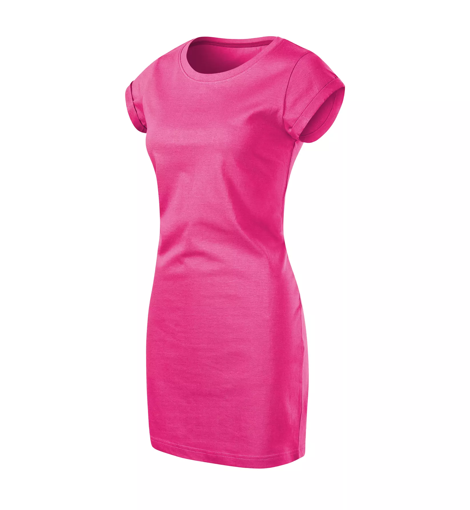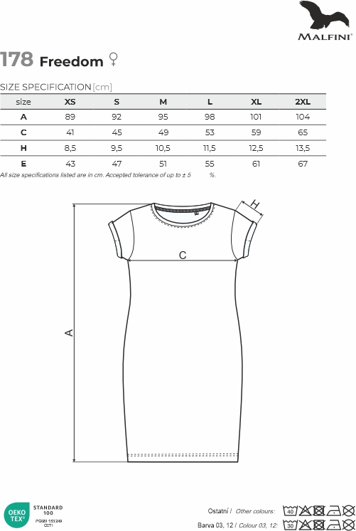 Damska sukienka Freedom 178 to stylowy i komfortowy model o gramaturze 180 g/m², wykonany w 100% z wysokiej jakości bawełny Single Jersey. Charakteryzuje się luźnym, lekko profilowanym krojem ze szwami bocznymi oraz długością powyżej kolan, co zapewnia swobodę ruchów i nowoczesny wygląd. Sukienka posiada szerszą okrągłą lamówkę wykończoną materiałem wierzchnim z dodatkiem 5% elastanu, a jej ramiona oraz kark zostały wzmocnione taśmami dla zachowania stabilności fasonu. Unikalnym detalem są podwinięte rękawy przyszyte w czterech punktach. Produkt należy do linii "label free", co oznacza brak głównej etykiety i gotowość do rebrandingu, stanowiąc idealną bazę pod personalizację za pomocą haftu, druku cyfrowego czy sitodruku.