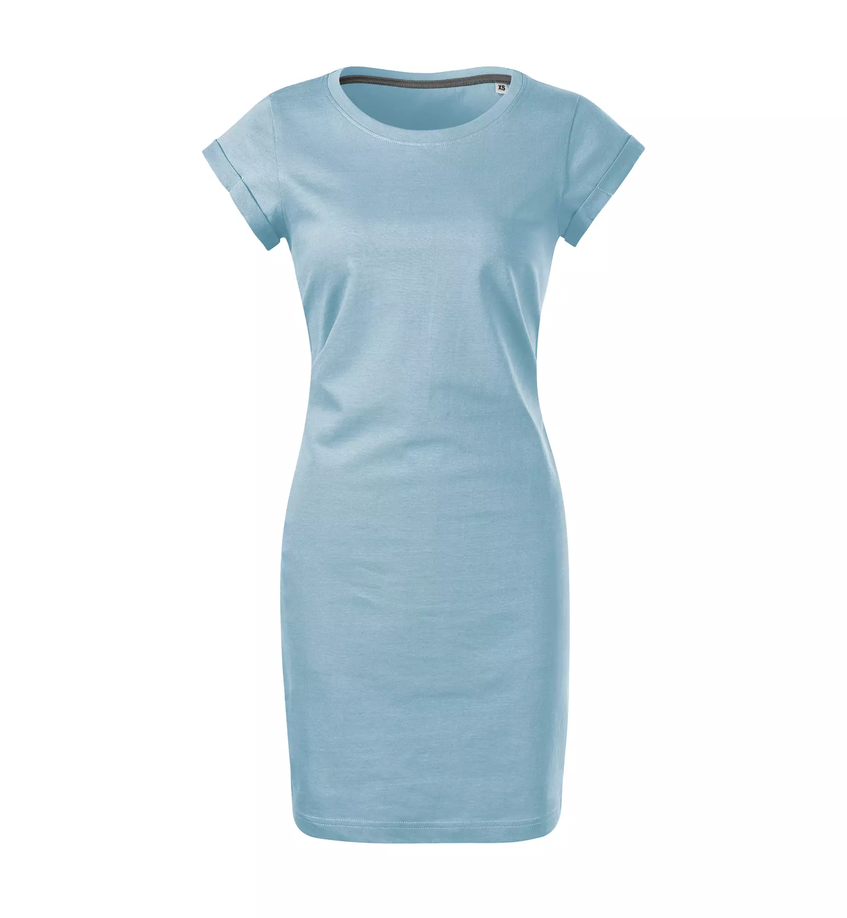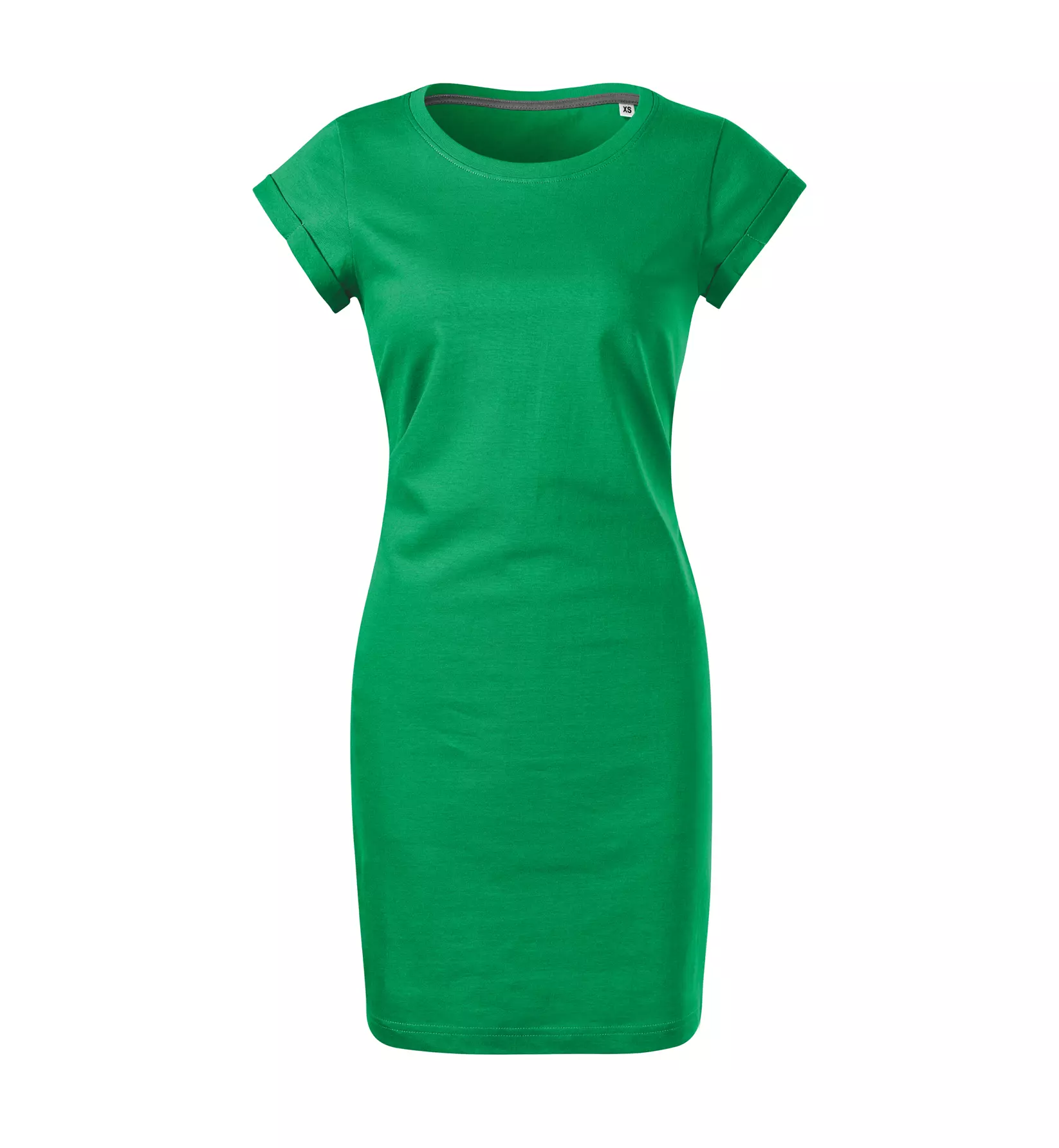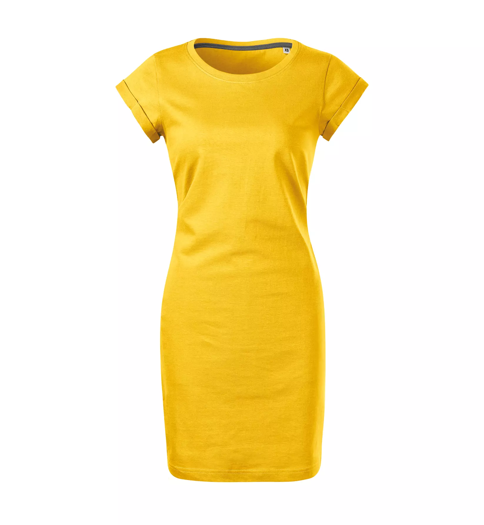Damska sukienka Freedom 178 to stylowy i komfortowy model o gramaturze 180 g/m², wykonany w 100% z wysokiej jakości bawełny Single Jersey. Charakteryzuje się luźnym, lekko profilowanym krojem ze szwami bocznymi oraz długością powyżej kolan, co zapewnia swobodę ruchów i nowoczesny wygląd. Sukienka posiada szerszą okrągłą lamówkę wykończoną materiałem wierzchnim z dodatkiem 5% elastanu, a jej ramiona oraz kark zostały wzmocnione taśmami dla zachowania stabilności fasonu. Unikalnym detalem są podwinięte rękawy przyszyte w czterech punktach. Produkt należy do linii "label free", co oznacza brak głównej etykiety i gotowość do rebrandingu, stanowiąc idealną bazę pod personalizację za pomocą haftu, druku cyfrowego czy sitodruku.