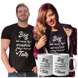 Koszulki dla Rodziców na Dzień Mamy i Taty zestaw z kubkami z napisem Bóg nie może być wszędzie dlatego stworzył Mamę i Bóg nie może być wszędzie dlatego stworzył Tatę w kolorze czarnym