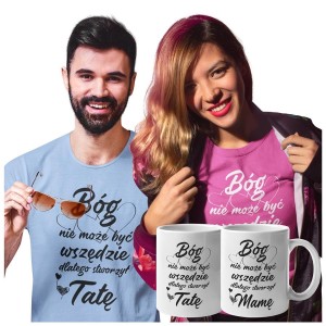 Koszulki dla Rodziców na Dzień Mamy i Taty zestaw z kubkami z napisem Bóg nie może być wszędzie dlatego stworzył Mamę i Bóg nie może być wszędzie dlatego stworzył Tatę w kolorze różowym i błękitnym