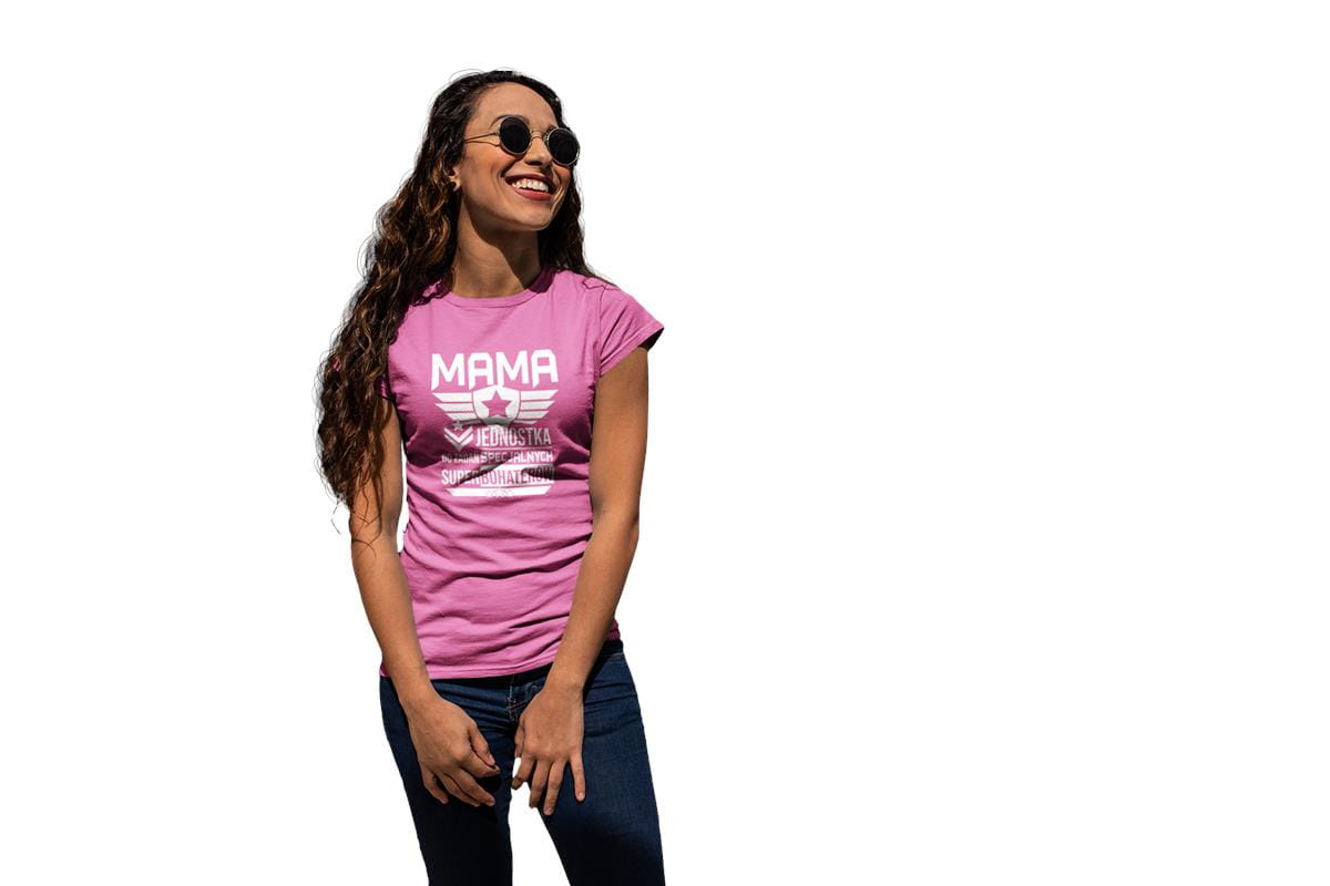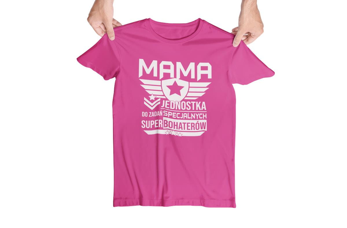 Koszulki z napisem " MAMA jednostka do zadań specjalnych super bohaterów" i "TATA jednostka do zadań specjalnych super bohaterów".