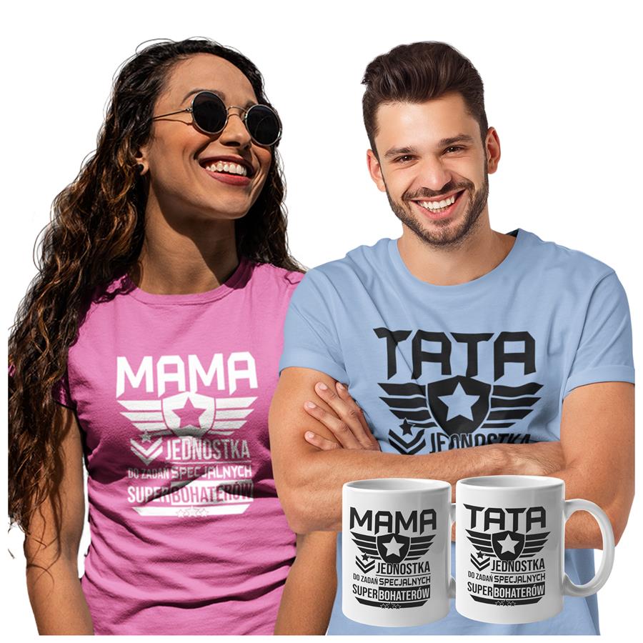 Koszulki dla Rodziców na Dzień Mamy i Taty zestaw z kubkami z napisem MAMA jednostka do zadań specjalnych super bohaterów i TATA jednostka do zadań specjalnych super bohaterów w kolorze różowym i błękitnym
