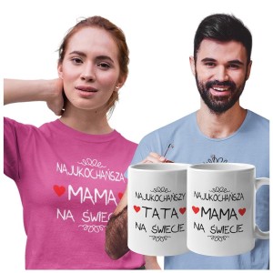 Koszulki dla Rodziców na Dzień Mamy i Taty zestaw z kubkami z napisem Najukochańsza mama na świecie i Najukochańszy tata na świecie w kolorze różowym i błękitnym