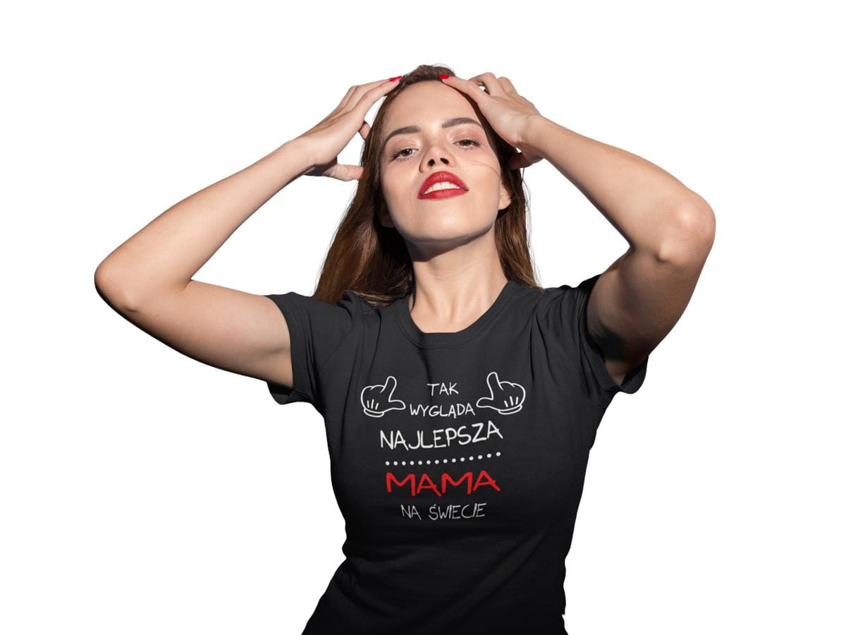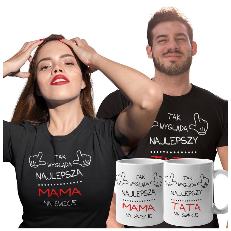 Koszulki dla Rodziców na Dzień Mamy i Taty zestaw z kubkami z napisem Tak wygląda najlepsza mama na świecie i Tak wygląda najlepszy tata na świecie w kolorze czarnym